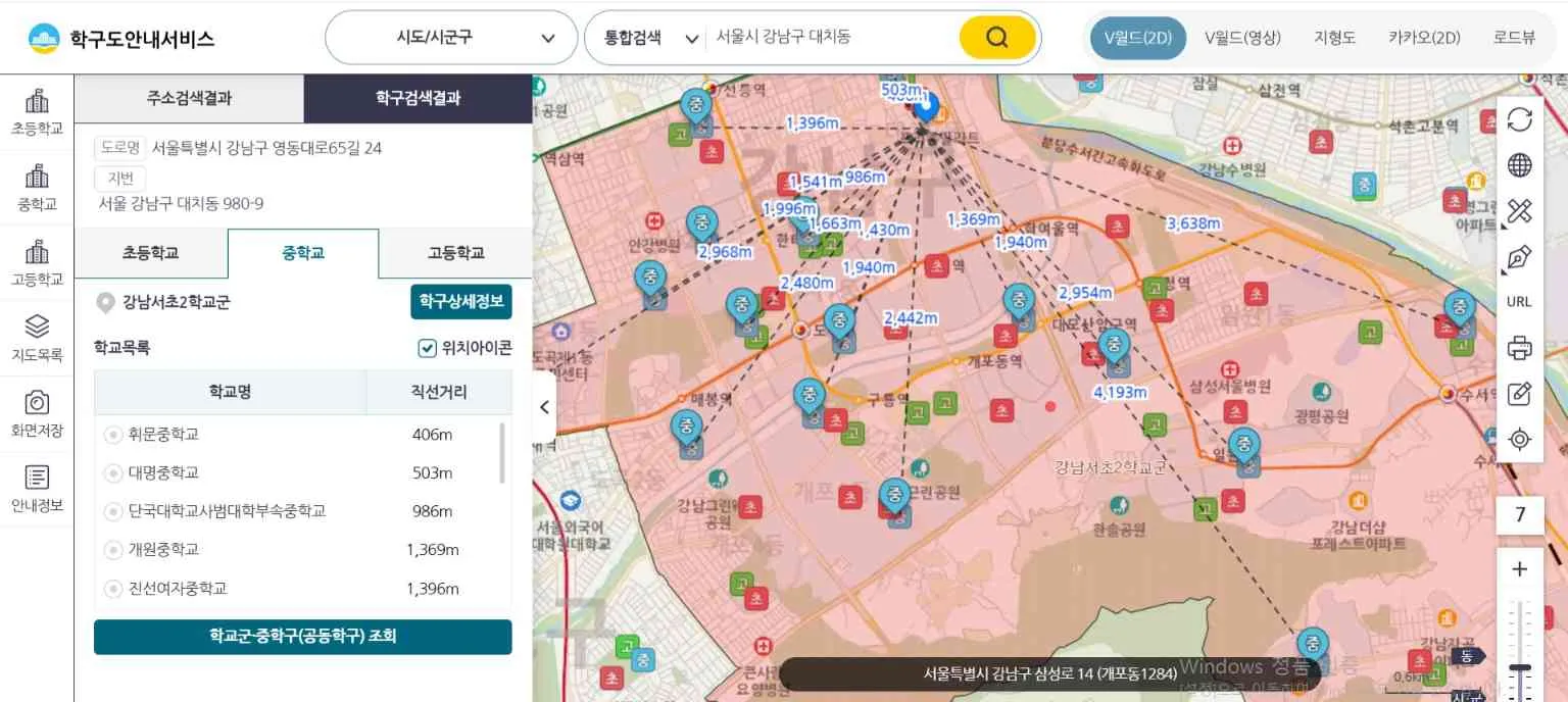 | 5. 학교군/학구 확인 | 초등학교 통학구역, 중학교 학구(학교군) 등이 색깔 또는 라인으로 표시되어 있어 배정될 학교 후보가 한눈에 파악됩니다. |