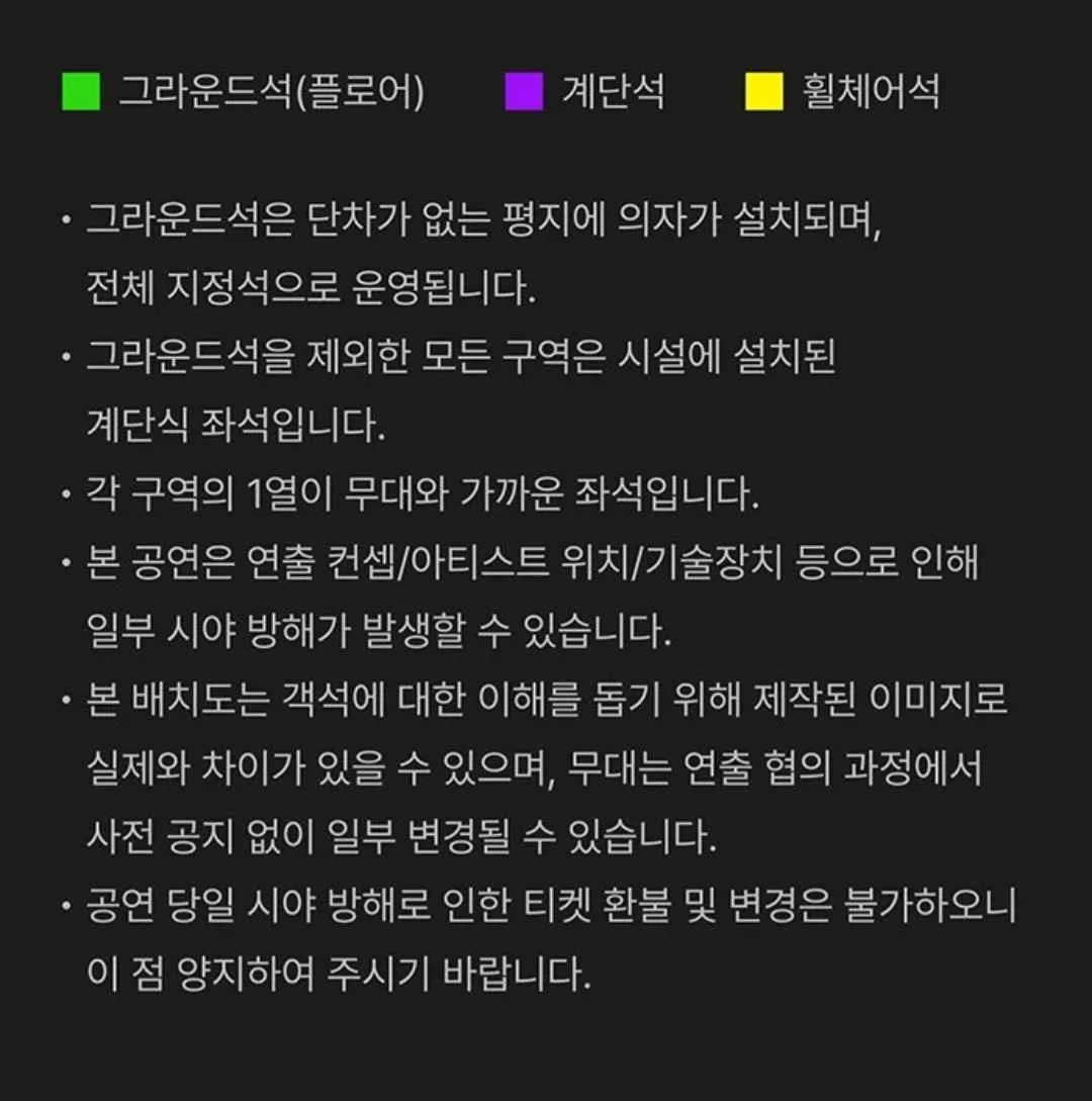 • 좌석: 그라운드석(플로어석) 및 계단석 모두 선택 가능.